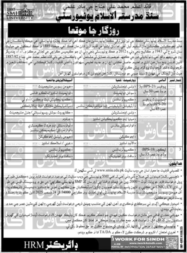 Vacancies in Sindh Madressatul Islam University Advertisement December 2025