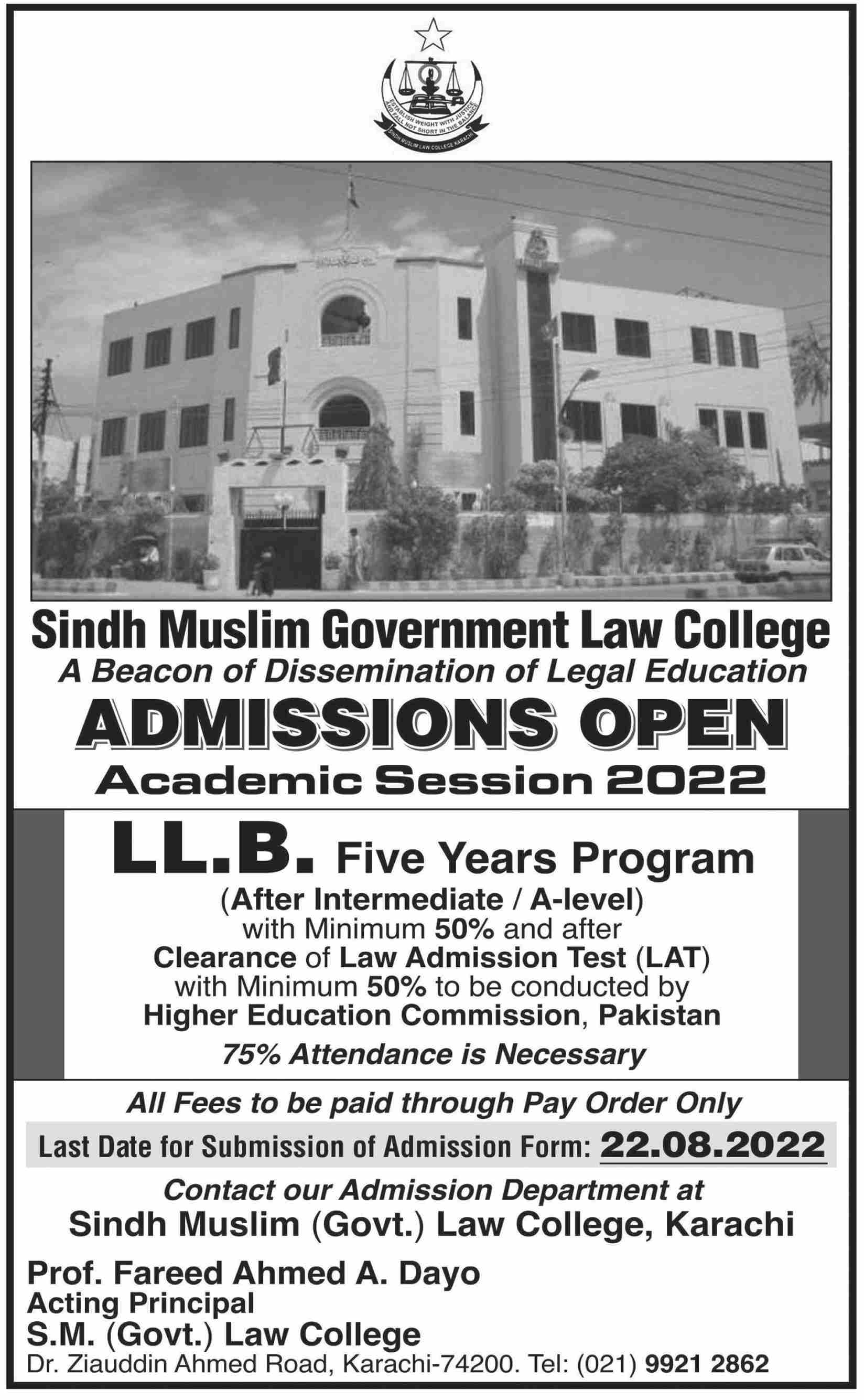 Sindh Muslim Government Law College has announced admissions 2022 for LLB 5 Years Program. Eligible students can apply for academic admissions 2022 in Sindh Muslim Government Law College Karachi Sindh Pakistan for Law College. Eligible students for fulfilling criteria for admissions in LLb can enroll as per Government admission policy 2022 till closing date 22 August 2022. Read newspaper ad for exact details.