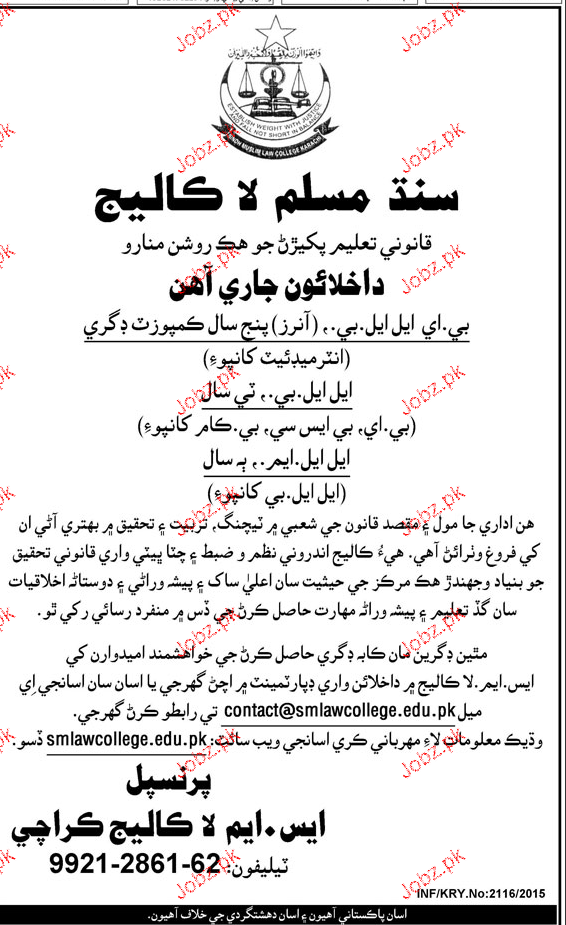 Sindh Muslim Law College Admission in LLB and LLM in Karachi. Read newspaper ad for exact details.