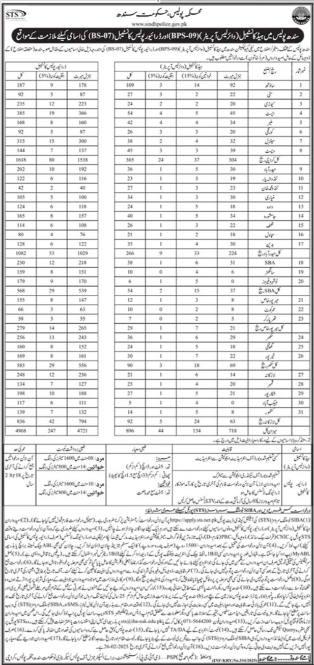 Sindh Police Karachi, jacobabad, ghotki, larkana, tharparkar, shikarpur, badin, kashmore, tando allahyar, matiari, jamshoro, thatta, sukkur, noushero feroz, sujawal, sanghar, mirpur khas, hyderabad, umerkot and dadu Sindh Pakistan invites applications from eligible candidates for the post of wireless operator, driver police constable and head constable as per advertisement of January 29, 2025 published in daily Jang Newspaper. Preferred Education is Matric and Intermediate etc.
