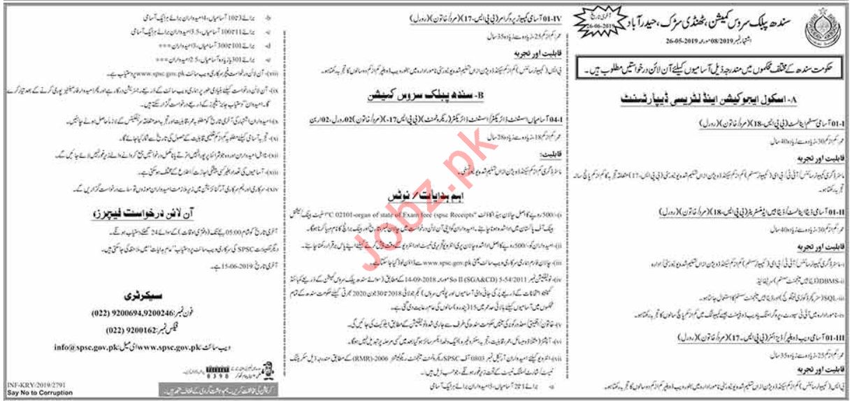 Sindh Public Service Commission SPSC is seeking applications from highly qualified and well educated individuals for the posts of System Analyst, Data Analyst, Database Administrator, Web Developer, Designer, Computer Programmer, Assistant Director for School Education & Literacy Department in Hyderabad.