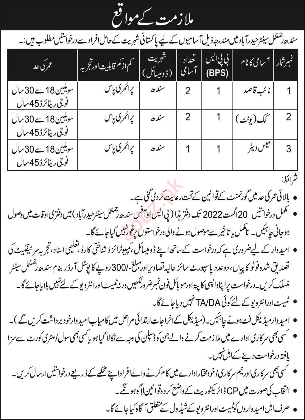 Pakistan Army, Sindh Regiment Center jobs advertisement dated about 11 August 2022 in daily Express Newspaper invites application for the vacant post of waiter, cook, naib qasid, cook unit and mess waiter in Hyderabad, hyderabad Sindh Pakistan. Educational qualifications required Primary etc.