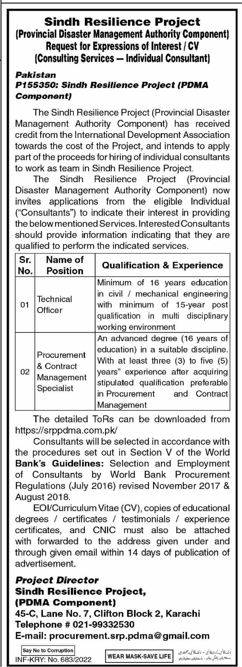 Vacant posts including Procurement Specialist, Contract Specialist and Technical Officer are announced in Provincial Disaster Management Authority PDMA Karachi Sindh Pakistan as per 18 February 2022 advertisement in daily Dawn Newspaper. Persons with Master and Bachelor etc. education can apply.
