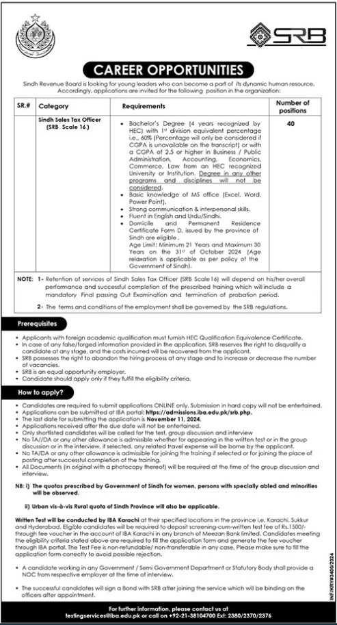 Apply at Sindh Revenue Board latest Government jobs in Management and departments before closing date which is around November 11, 2024 or as per closing date in newspaper ad. Read complete ad online to know how to apply on latest Sindh Revenue Board job opportunities.