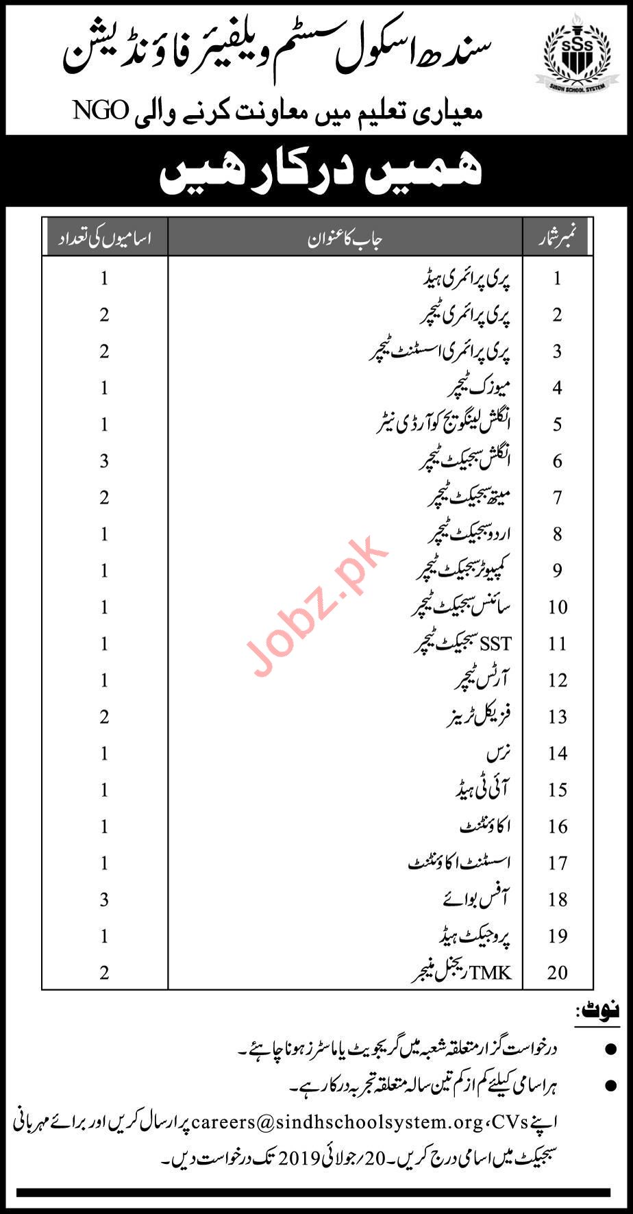 Vacancies in Sindh School System Welfare Foundation Advertisement July 2019