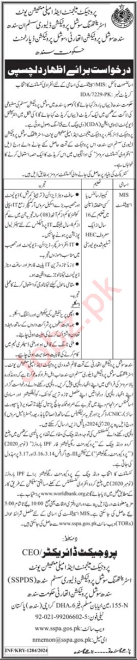 Sindh Social Protection Authority SSPA jobs advertisement dated about 12 May 2024 in daily Jang Newspaper invites application for the vacant post of mis specialist in Karachi, karachi Sindh Pakistan. Preferred Education is MS, Bachelor and Master etc.