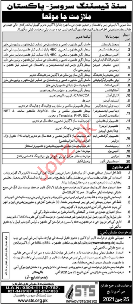 Sindh Testing Services STS Islamabad, Pakistan is seeking candidates for the posts of Regional Director, Project Manager, Office Secretary, Manager Planning, Manager Operations, Deputy Manager Human Resource, Deputy Manager Marketing, Deputy Manager Examination, Office Assistant, Accountant, Internal Auditor, Web Developer, Web Designer, Database Administrator, Software Engineer, Computer Technician, Computer Operator, Data Entry Operator, Computer Graphics Designer, Office Boy, Driver, Security Guard. STS 2021 Apply Online & Application Form Download.