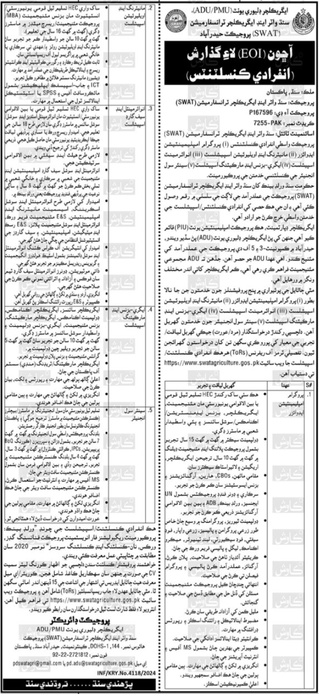Vacancies in Sindh Water and Agriculture Transformation Project SWAT Advertisement December 2024