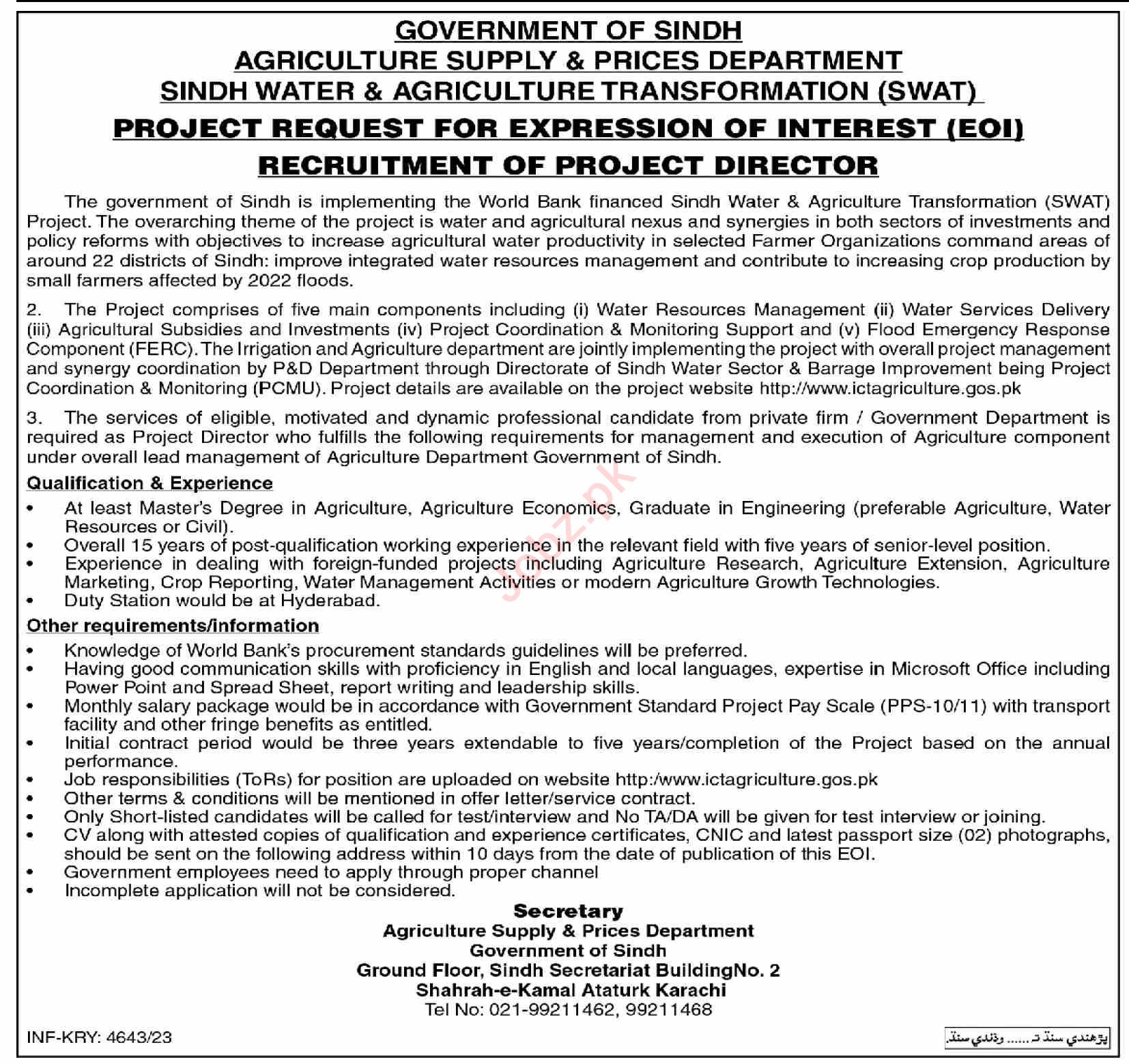 Agricultural Supply & Prices Department Karachi, karachi Sindh Pakistan invites applications from eligible candidates for the post of project director as per advertisement of December 10, 2023 published in daily Dawn Newspaper. Master etc. educational qualification will be preferred.