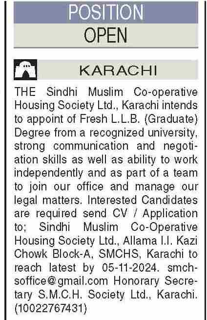 Sindhi Muslim Cooperative Housing Society latest Classifieds Legal jobs and others can be applied till 5 November 2024 or as per closing date in newspaper ad. Read complete ad online to know how to apply on latest Sindhi Muslim Cooperative Housing Society job opportunities. Overtime might be allowed. Employer provides medical, accommodation and transport facility.