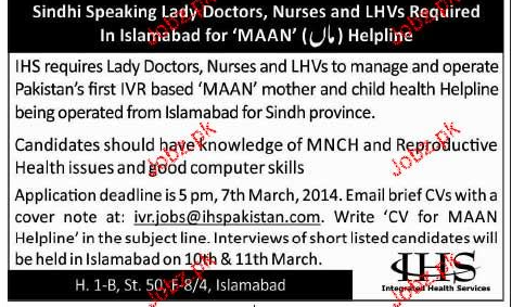 Sindhi Speaking Lady Doctors, Nurses Job Opportunity