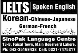 SINOpak Language Centre has announced admissions in Korean Language Course, Chinese Language Course, Japanese Language Course, German Language Course & French Language Course in Lahore. Read newspaper ad for exact details.