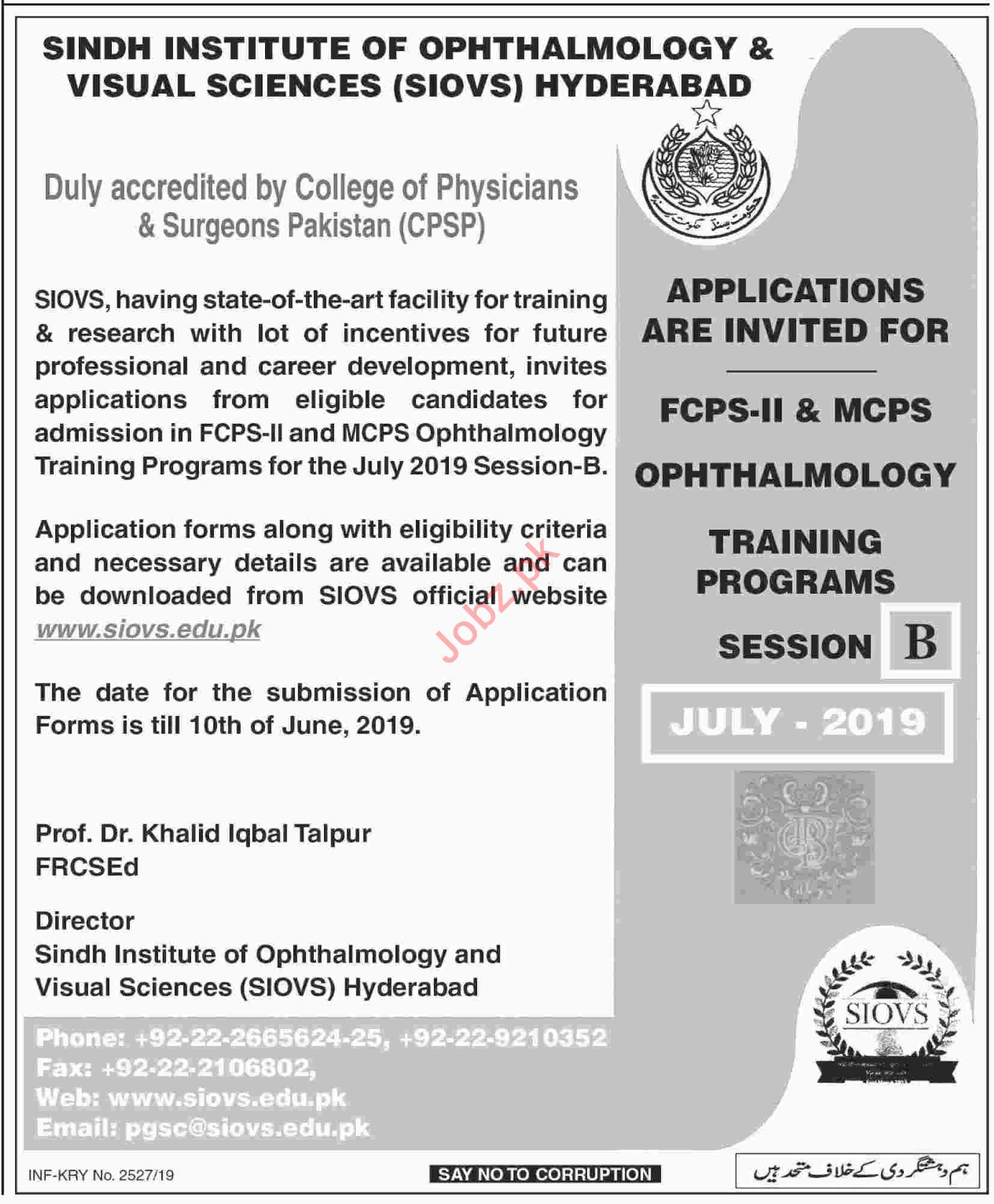 Vacancies in Sindh Institute of Ophthalmology & Visual Sciences SIOVS Advertisement May 2019