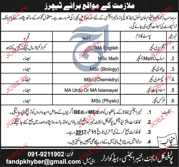 Latest Sir Sahib Zada Abdul Qayyum Khan School and College Teaching Posts Khyber Agency 2025