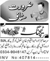 Sir Sahibzada Abdul Qayyum Khan School & College Peshawar, peshawar Khyber Pakhtunkhwa KPK Pakistan invites applications from eligible candidates for the post of teacher and urdu teacher as per advertisement of April 29, 2022 published in daily Aaj Newspaper. Candidates with MA etc. educational background will be preferred.