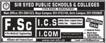 Sir Syed Public School & College admissions 2022 for Intermediate Part I, FSc Pre Medical, FSc Pre Engineering, ICS Computer Science, I.Com has been announced. Eligible students who qualify as per admission criteria in Sir Syed Public School & College Rawalpindi Punjab Pakistan can apply in Science College for academic year 2022. Students for admissions in ICS, I.com and Intermediate can apply for online or campus classes as per Government institute criteria till admission closing date August 15, 2022. Read newspaper ad for exact details.