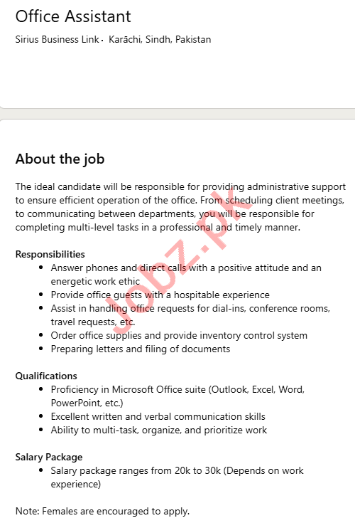 Sirius Business Link Karachi Jobs 2021 for Office Assistant
