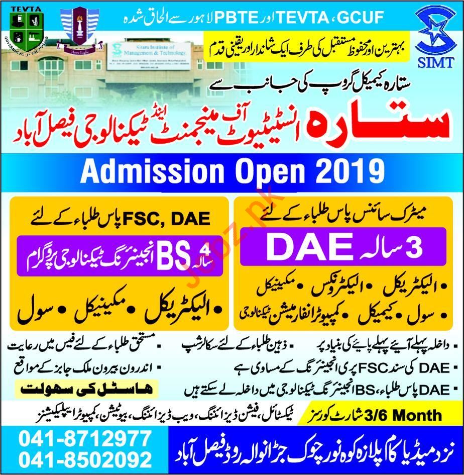 Sitara Institute of Management and Technology SIMT Faisalabad, Pakistan are started admissions fall 2019 for the classes of F Sc & DAE in Electrical, Mechanical & Civil Engineering. Read newspaper ad for exact details.