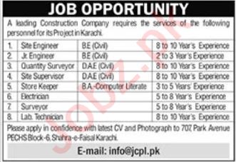 Construction Company invites applications for job positions advertised in daily The News dated 10 August 2025 for following vacancies in Shahrah-e-Faisal Karachi, karachi Sindh Pakistan.