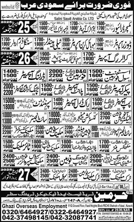 Vacant posts including steel fixer, shuttering carpenter, auto electrician, plant operator, mechanic foreman, assistant civil foreman, drilling operator, pump operator, foreman mason, construction manager, dozer operator, crane operator, machine mechanic, bomb truck operator, superintendent, truck mechanic foreman, batching operator, site supervisor, single drum roller, mechanic shop body, foreman welder, service mechanic foreman supervisor, concert mixture truck driver, rock drill operator, dg foreman, welder, mechanic fitter, tire mechanic, foreman shuttering carpenter, workshop foreman, service mechanic, site engineer, mobile concrete pump operator, crashing operator, mason, plant supervisor, mechanic construction, packer operator, truck mechanic, crawler rig operator, rigger dumper truck and tele handler are announced in Harmain Trade Test & Technical Training Center Riyadh, dammam Saudi Arabia as per 24 April 2025 advertisement in daily Express Newspaper. Persons with Bachelor, Intermediate, Matric, B.E and DAE etc. education can apply.