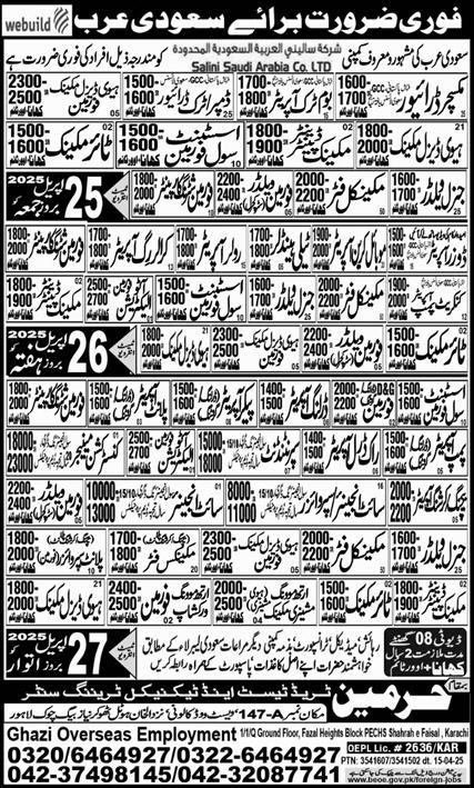 Harmain Trade Test & Technical Training Center Riyadh, dammam Saudi Arabia invites applications from eligible candidates for the post of pump operator, shuttering carpenter, rigger dumper truck, crawler rig operator, plant operator, construction manager, foreman welder, truck mechanic foreman, crashing operator, concert mixture truck driver, plant supervisor, superintendent, batching operator, tele handler, mechanic foreman, packer operator, tire mechanic, mechanic construction, crane operator, site engineer, mechanical fitter, steel fixer, auto electrician, mobile concrete pump operator, welder, mechanic shop body, general welder, mason, mechanics fitter, dg foreman, truck mechanic, assistant civil foreman, foreman shuttering carpenter, foreman mason, bomb truck operator, single drum roller, rock drill operator, drilling operator, service mechanic foreman supervisor, workshop foreman, site supervisor, dozer operator, machine mechanic, mechanic fitter and service mechanic as per advertisement of April 25, 2025 published in daily Express Newspaper. Educational qualifications required Matric, DAE, B.E, Intermediate and Bachelor etc.