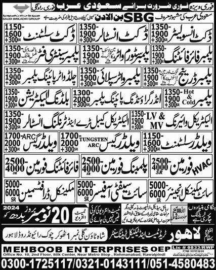 Lahore Trade Test & Technical Training Center jobs advertisement dated about 20 November 2024 in daily Express Newspaper invites application for the vacant post of Electrical Technician, Plumber Sanitary Fitter, Welder Assistant, Plumber Storm Water, Duct Installer, Plumber Drainage, Plumber Fire Fighting, Plumbing Foreman, Gas Welder, Site Mechanical Engineer, Mechanical Draftsman, Duct Insulator, Plumber Water Supply, Duct Assistant, Electrical Cable Tray Trunking Installer, Electrical Wiring, Plumber Hot Cold, Hvac Foreman, Site Safety Officer and Fire Fighting Foreman in Riyadh, dammam Saudi Arabia. Candidates with Intermediate, DAE, B.E, Bachelor and Matric etc. educational background will be preferred.