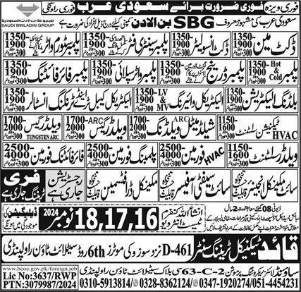 Apply at Quaid Technical Training Center latest Overseas jobs in Industrial and departments before closing date which is around November 18, 2024 or as per closing date in newspaper ad. Read complete ad online to know how to apply on latest Quaid Technical Training Center job opportunities. Salary varies from 295000. Overtime is allowed. Free medical, accommodation and transport may be available.