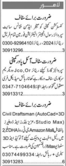 Private Company is looking for candidates for following posts as per job advertisement published in daily Express Newspaper of March 22, 2025 for location DHA Phase 2 Lahore, lahore Punjab Pakistan: