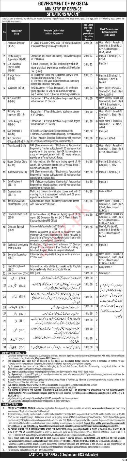 Ministry of Defence jobs advertisement dated about 22 August 2022 in daily Kawish Newspaper invites application for the vacant post of sanitary worker, udc, security sub inspector superviso, special staff, traffic analyst supervisor, mali, lady receptionist, site supervisor, wireman, sub engineer, draughtsman, gardener, driver, sub inspector, lascer, sub divisional officer, ltv driver, security supervisor, traffic analyst, charge nurse, assistant director, lower division clerk, sub divisional officer monitoring, cook, naib qasid, upper division clerk, assistant manager infrastructure securit technician, sub divisional officer evaluation, assistant, security assistant, ldc, mess waiter, technical monitoring staff and operator special in Islamabad, islamabad Islamabad Pakistan. Candidates with Master, M.sc, MA, Bachelor and MS etc. educational background will be preferred.