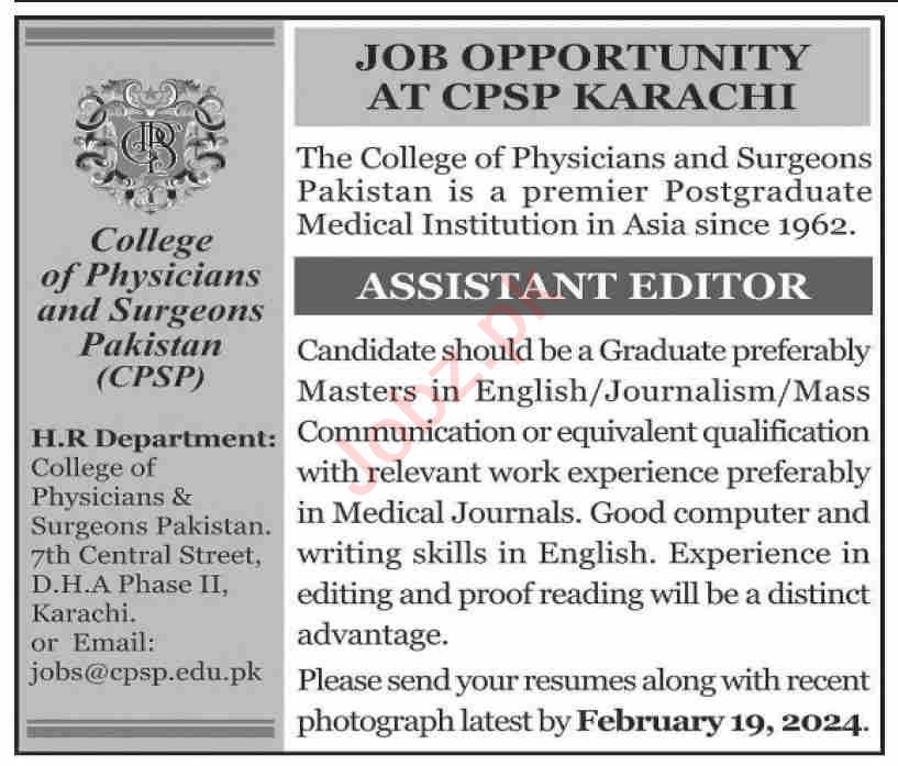 College of Physicians and Surgeons Pakistan invites applications for job positions advertised in daily Dawn dated 4 February 2024 for following vacancies in Karachi, karachi Sindh Pakistan.