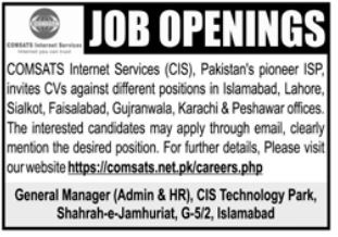COMSATS Internet Services G-5 Islamabad, islamabad Islamabad Pakistan invites applications from eligible candidates for the post of Assistant Manager Networks, Corporate Sales Executive, Developer, Manager Perations, Field Support Engineer, Manager Hosting, Assistant Manager Sales and Deputy General Manager Operations as per advertisement of November 5, 2025 published in daily Jang Newspaper. Educational qualifications required Bachelor and Master etc.