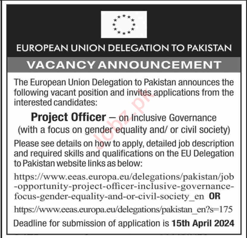European Union Delegation to Pakistan Islamabad, islamabad Islamabad Pakistan invites applications from eligible candidates for the post of project officer as per advertisement of March 24, 2024 published in daily Dawn Newspaper. Candidates with Bachelor and Master etc. educational background will be preferred.