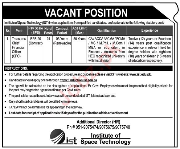 Institute of Space Technology IST jobs advertisement dated about 13 August 2023 in daily Nation Newspaper invites application for the vacant post of chief financial officer and treasurer in Islamabad, islamabad Islamabad Pakistan. Persons with MS, M.com, Mphil, MBA, CA and ACCA etc. education can apply.