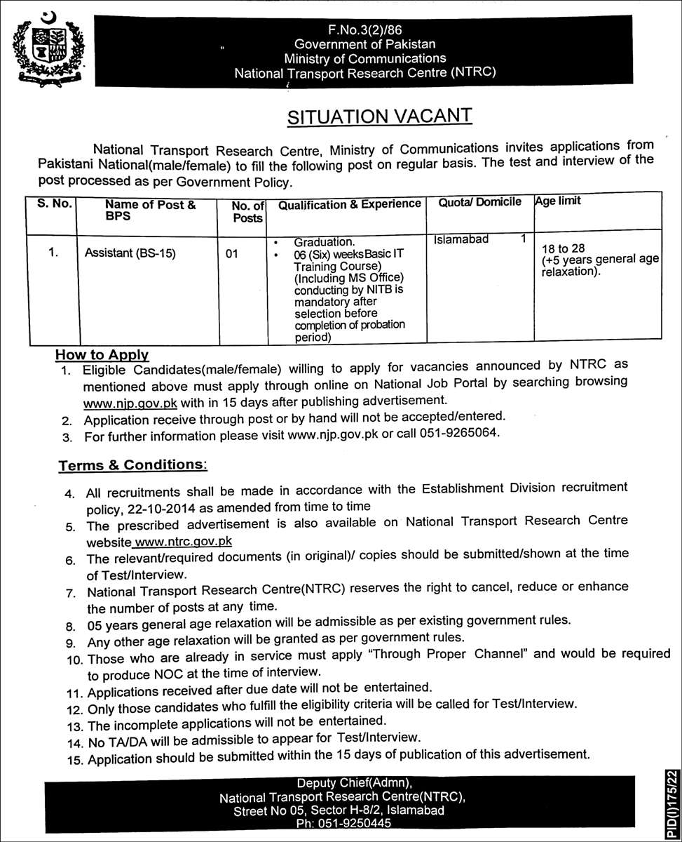 Ministry of Communication invites applications for job positions advertised in daily Nawaiwaqt dated 8 July 2022 for following vacancies in Islamabad, islamabad Islamabad Pakistan.