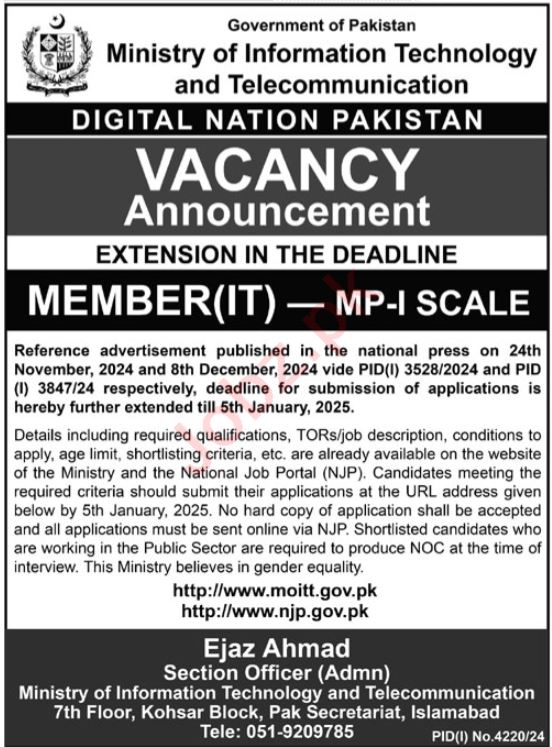 Vacancies in Ministry of Information Technology & Telecommunication MOIT Advertisement December 2024