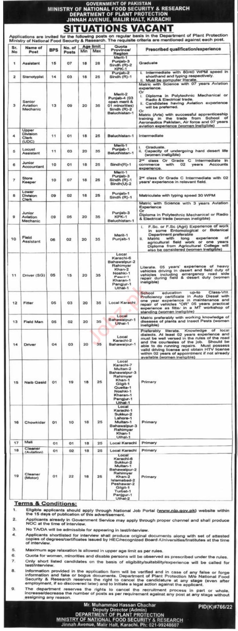 Vacant posts including mali, cleaner aviation, naib qasid, assistant, field assistant, aviation mechanic, chowkidar, driver, accountant, store keeper, fitter, lower division clerk, steno typist, locust assistant, upper division clerk, cleaner motor and field man are announced in Ministry of National Food Security & Research MNFSR Karachi, karachi Sindh Pakistan as per 25 September 2022 advertisement in daily Daily Pakistan Newspaper. Primary, Matric, Others, Middle, Bachelor and Intermediate etc. educational qualification will be preferred.