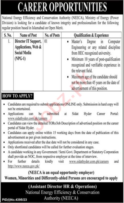 Vacant posts including director it support are announced in National Energy Efficiency & Conservation Authority Islamabad, islamabad Islamabad Pakistan as per 21 January 2024 advertisement in daily K2 Newspaper. Master and MS etc. educational qualification will be preferred.