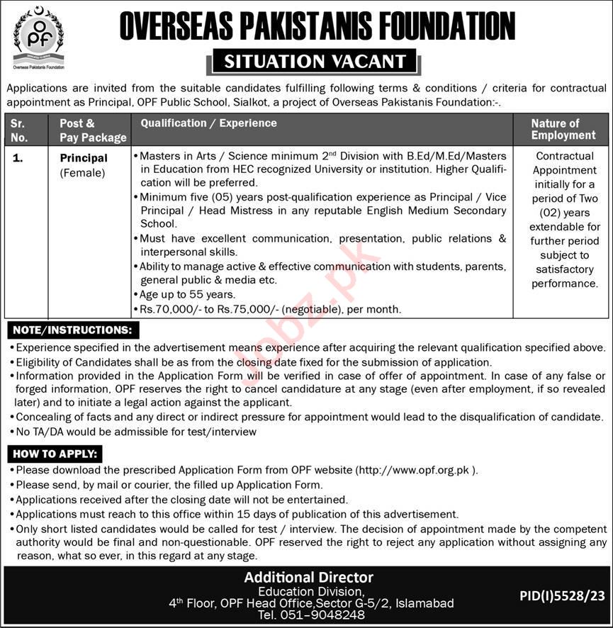OPF Public School jobs advertisement dated about 17 March 2024 in daily Express Newspaper invites application for the vacant post of female principal in Sialkot, sialkot Punjab Pakistan. Persons with M.ed, B.ed and Master etc. education can apply.