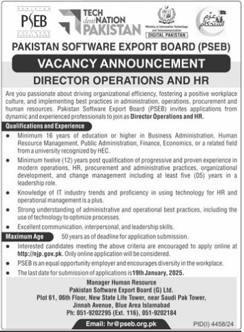 Vacancies in Pakistan Software Export Board PSEB Advertisement January 2025