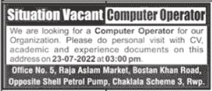 Vacant posts including computer operator are announced in Private Organization Rawalpindi, rawalpindi Punjab Pakistan as per 19 July 2022 advertisement in daily Jang Newspaper. Persons with Bachelor and Master etc. education can apply.