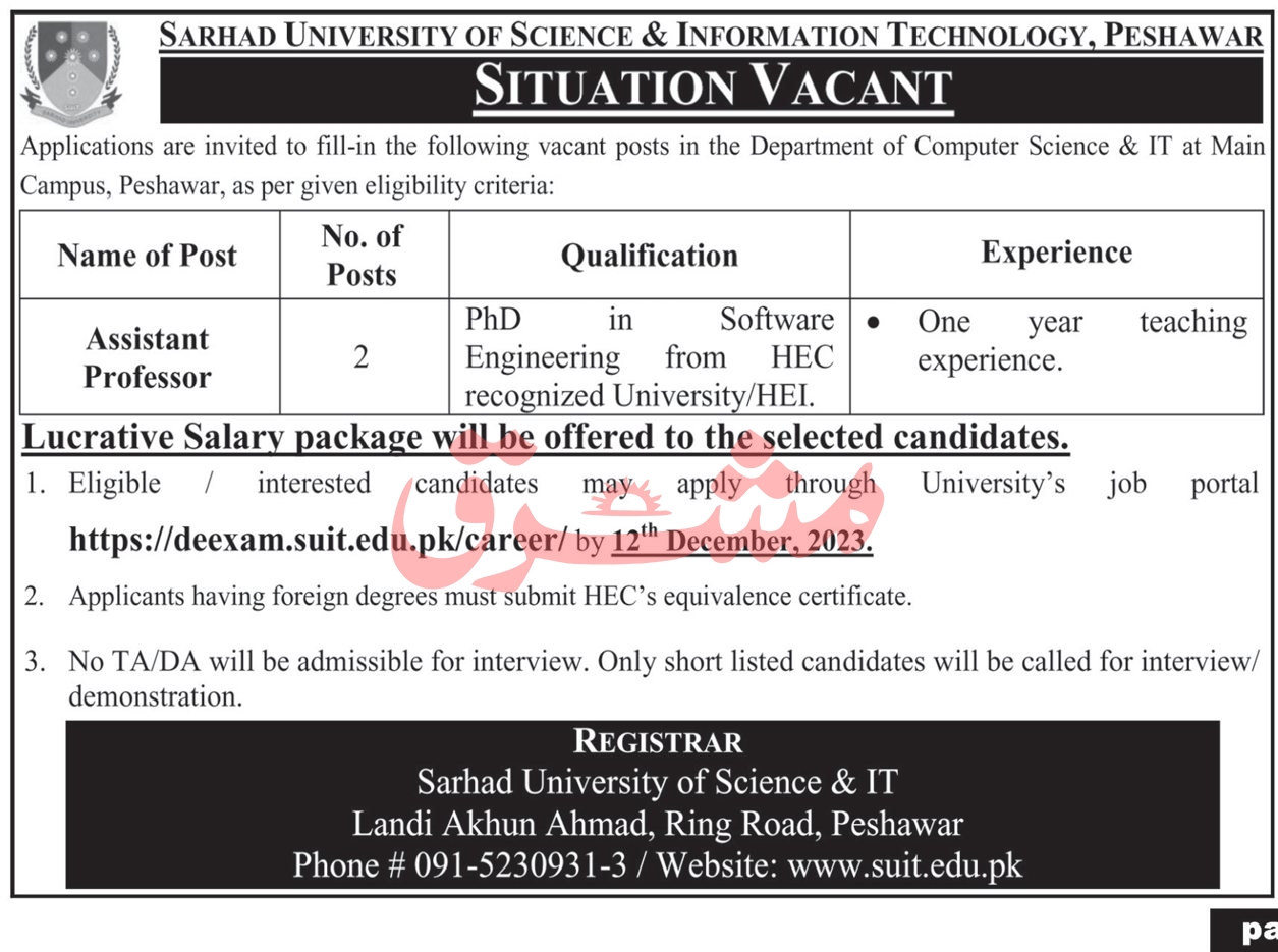 Sarhad University of Science & Information Technology invites applications for job positions advertised in daily Mashriq dated 3 December 2023 for following vacancies in Peshawar, peshawar Khyber Pakhtunkhwa KPK Pakistan.
