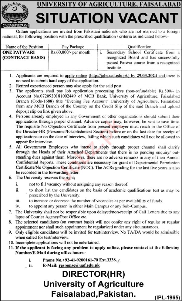 Vacant posts including patwari are announced in University of Agriculture UAF Faisalabad, faisalabad Punjab Pakistan as per 10 March 2024 advertisement in daily Nawaiwaqt Newspaper. Persons with Matric and Others etc. education can apply.
