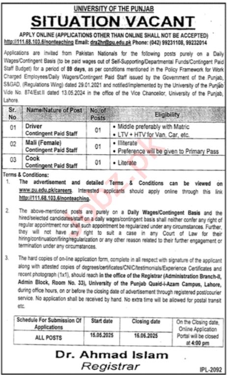 Situation Vacant at University Of The Punjab PU