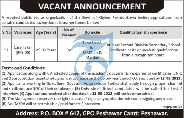 Public Sector Organization Dera Ismail Khan, mardan and dera ismail khan Khyber Pakhtunkhwa KPK Pakistan invites applications from eligible candidates for the post of care taker as per advertisement of April 21, 2022 published in daily Aaj Newspaper. Candidates with Matric etc. educational background will be preferred.