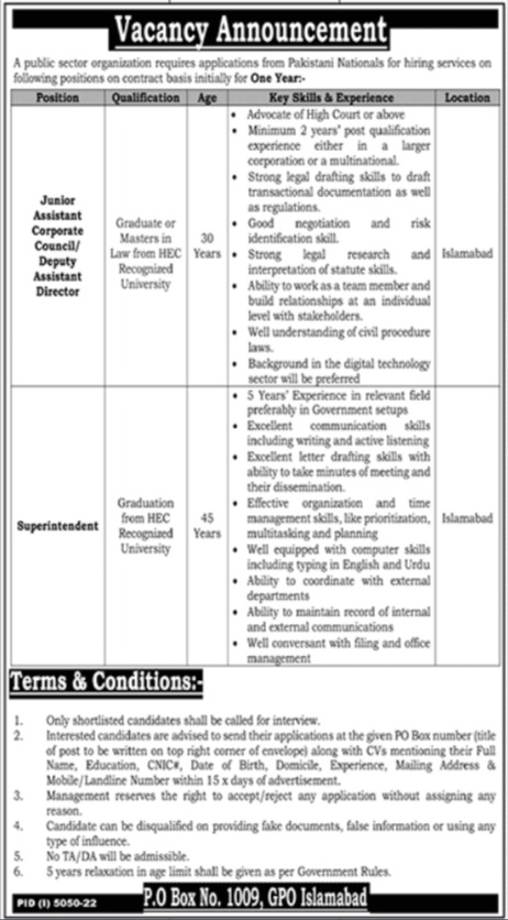 Public Sector Organization jobs advertisement dated about 14 February 2023 in daily Jang Newspaper invites application for the vacant post of deputy assistant director, superintendent and assistant corporate council in Islamabad, islamabad Islamabad Pakistan. Educational qualifications required LLb, LLM, Bachelor and Master etc.