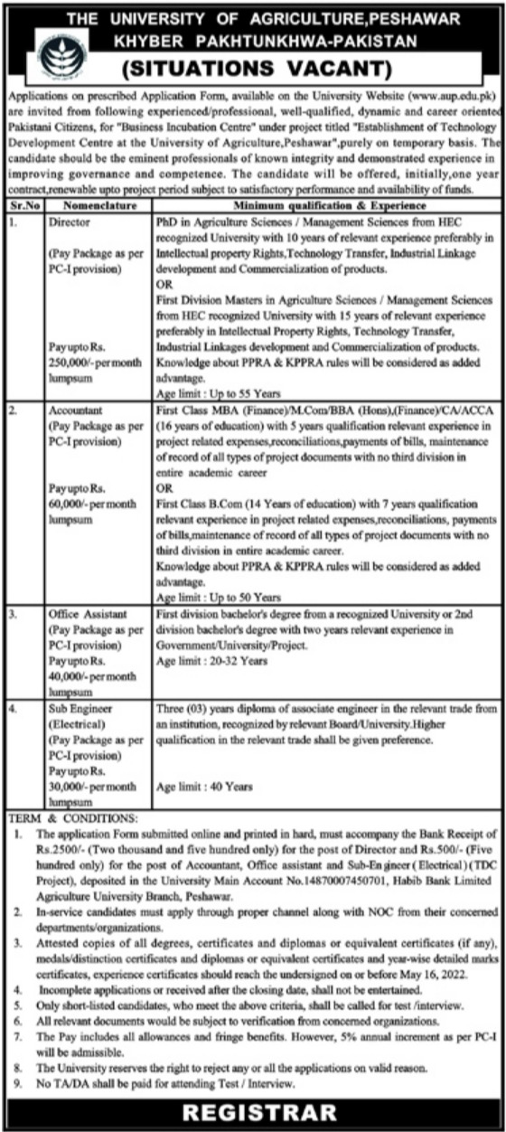The University Of Agriculture Peshawar, peshawar Khyber Pakhtunkhwa KPK Pakistan invites applications from eligible candidates for the post of director, accountant, office assistant and sub engineer as per advertisement of April 17, 2022 published in daily Mashriq Newspaper. Preferred Education is DAE, CA, Phd, BBA, ACCA, M.com, MBA and Bachelor etc.