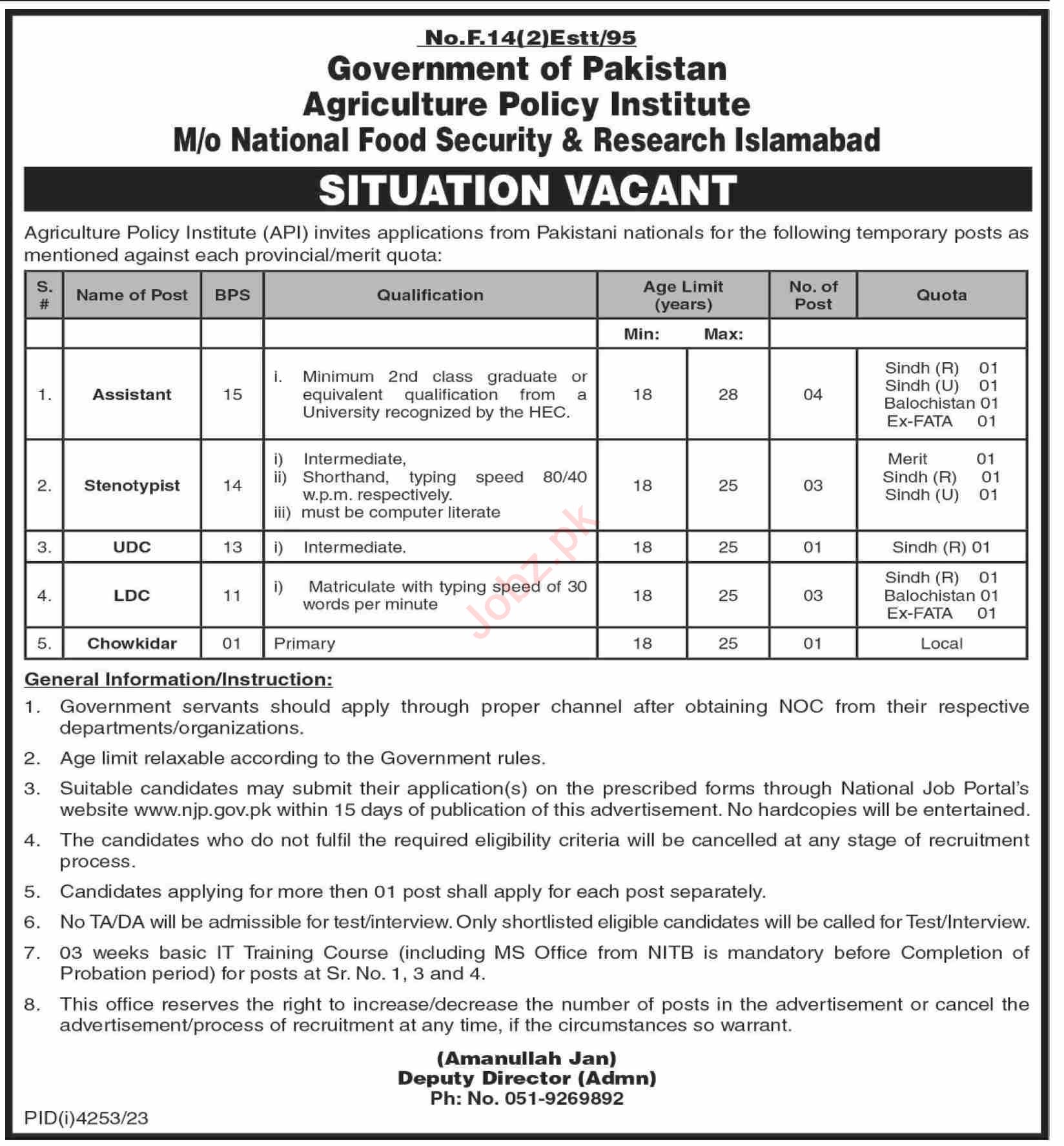 Situations Vacant At Agriculture Policy Institute Islamabad