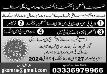AM Welfare Society jobs advertisement dated about 21 June 2024 in daily Express Newspaper invites application for the vacant post of anaesthesia technologist, dispenser, staff nurse and anaesthesia specialist in Okara, okara Punjab Pakistan. Persons with Intermediate, MBBS and Others etc. education can apply.
