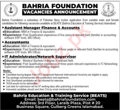 Bahria Education & Training Services Islamabad, islamabad Islamabad Pakistan invites applications from eligible candidates for the post of assistant manager finance accounts, network supervisor, it administrator and accountant as per advertisement of February 19, 2024 published in daily Jang Newspaper. Preferred Education is Master, MBA and Bachelor etc.