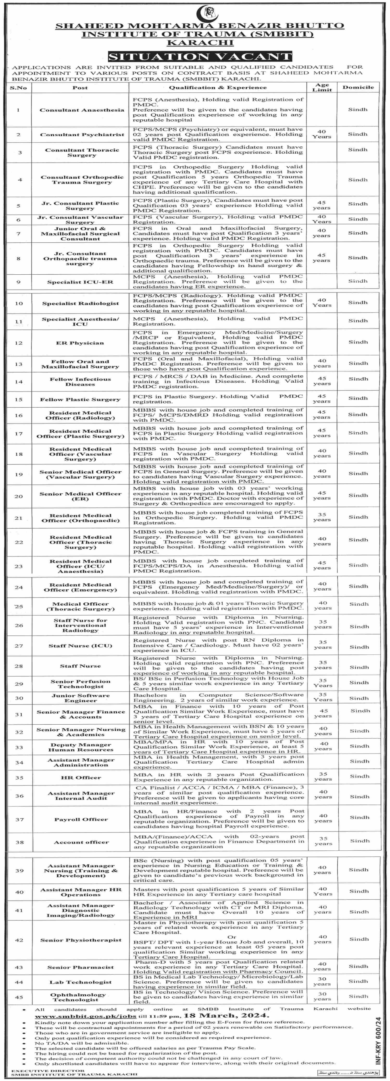 Shaheed Mohtarma Benazir Bhutto Institute of Trauma SMBBIT invites applications for job positions advertised in daily Dawn dated 3 March 2024 for following vacancies in Karachi, karachi Sindh Pakistan.